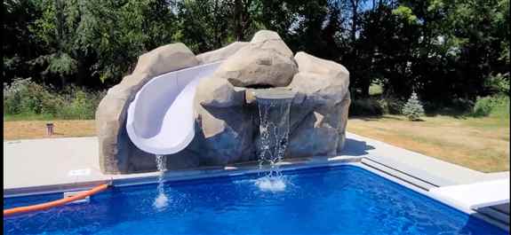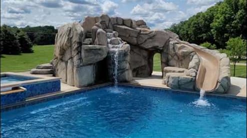 Backyard pool-scaping with added faux rock work features.